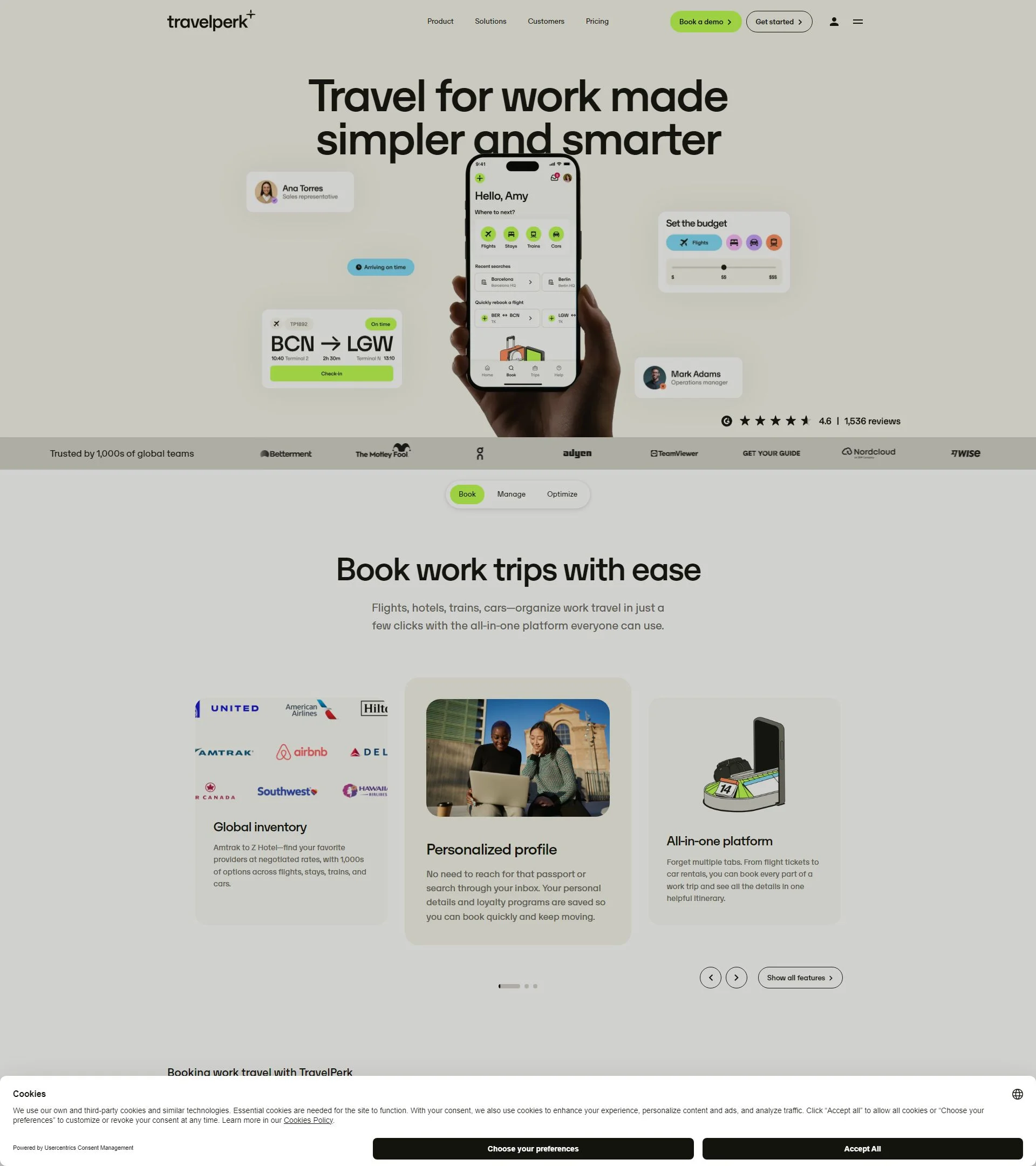 Business travel booking, policy control, spend tracking, and traveler support.